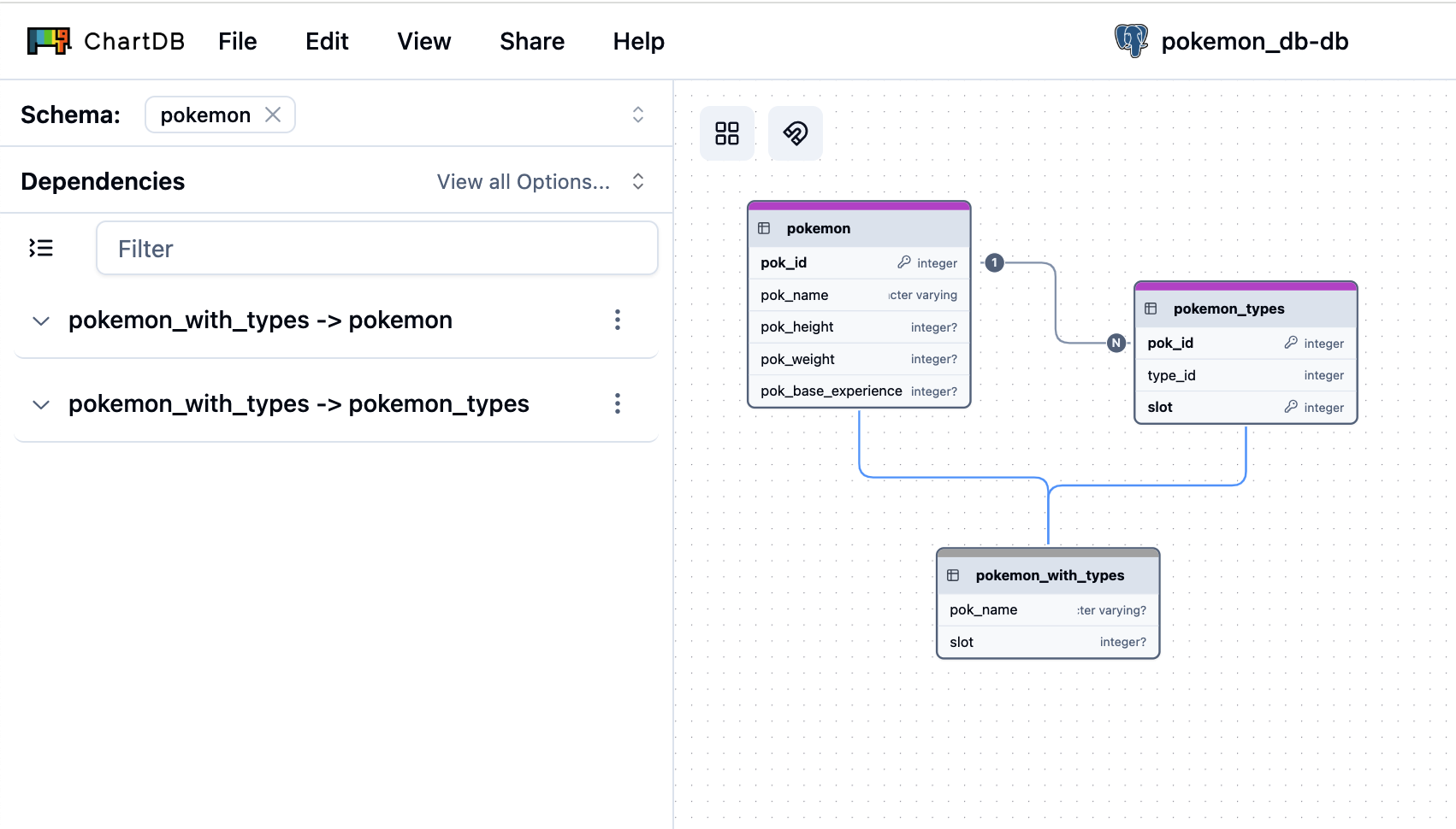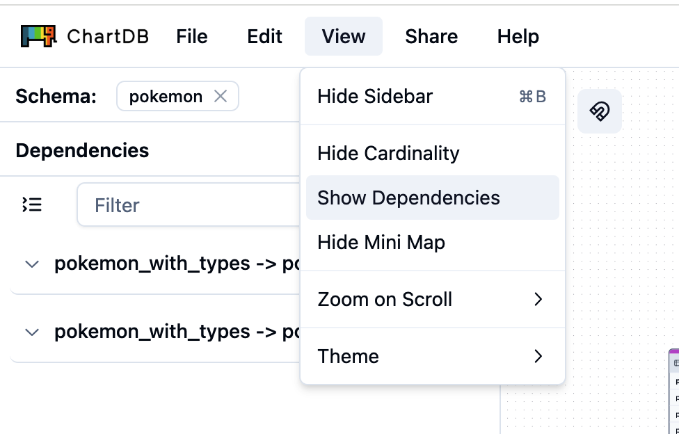 ChartDB automatically detects and displays dependencies based on the imported