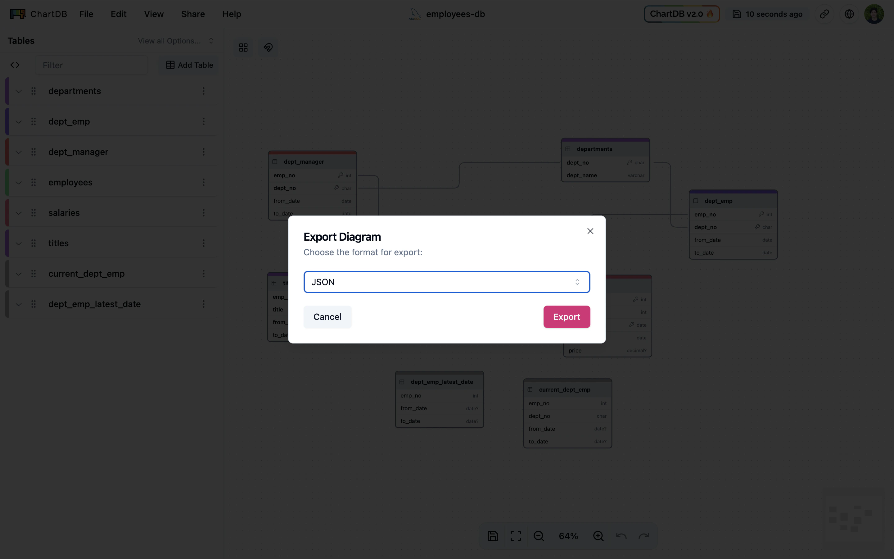 The Export Diagram (JSON) feature requires an upgraded subscription on ChartDB Cloud. See our Cloud vs Self-Hosted documentation for more details.