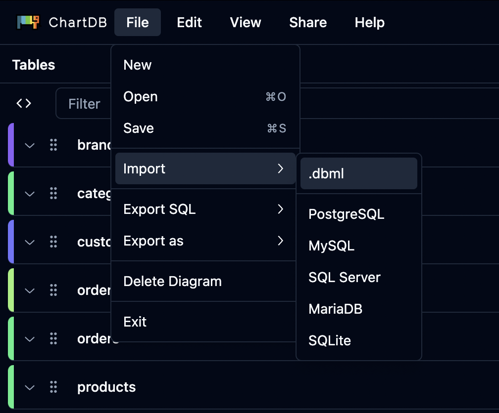 Click File → Import → .dbml